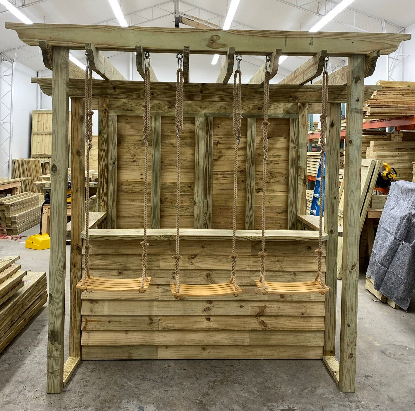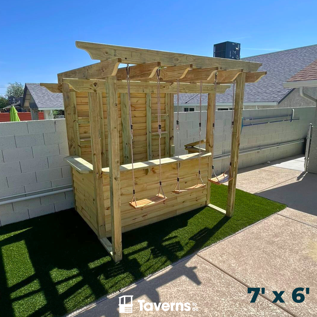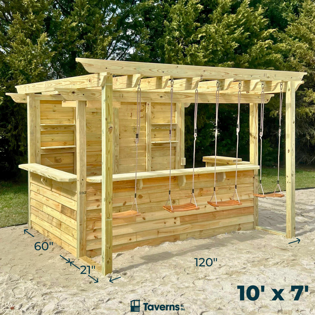 Swing up your bar game with an outdoor bar with built-in swings!  This model is available in our original design with corrugated roofing, or with a pergola roof.