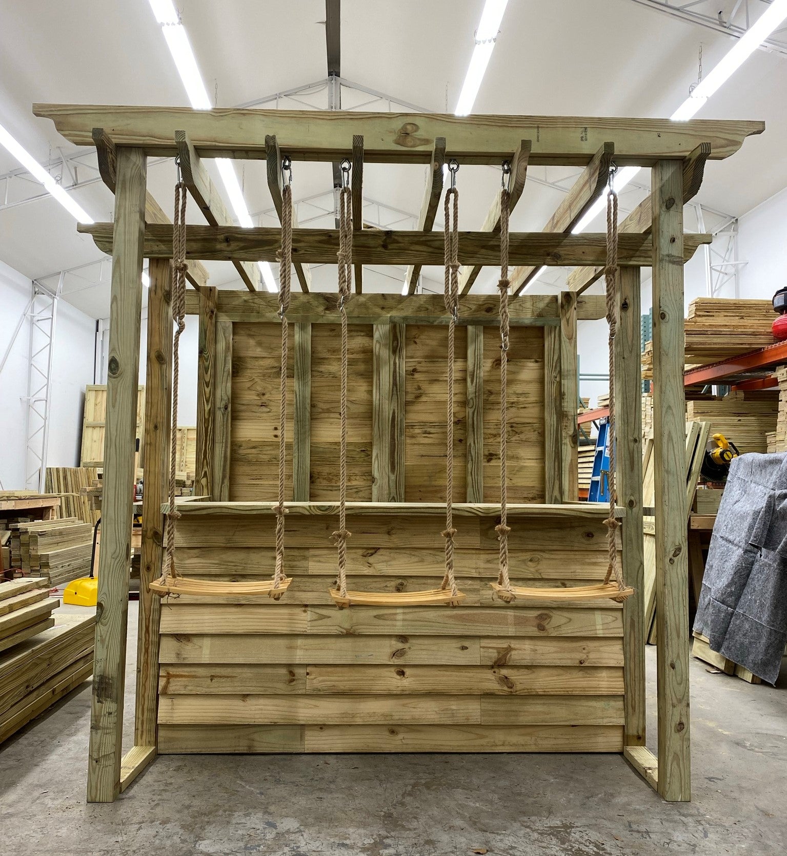 10' wide x 7' deep; (4) swings with 10' x 5' bar plus a 1'-9" extension to the front to support the swing sets